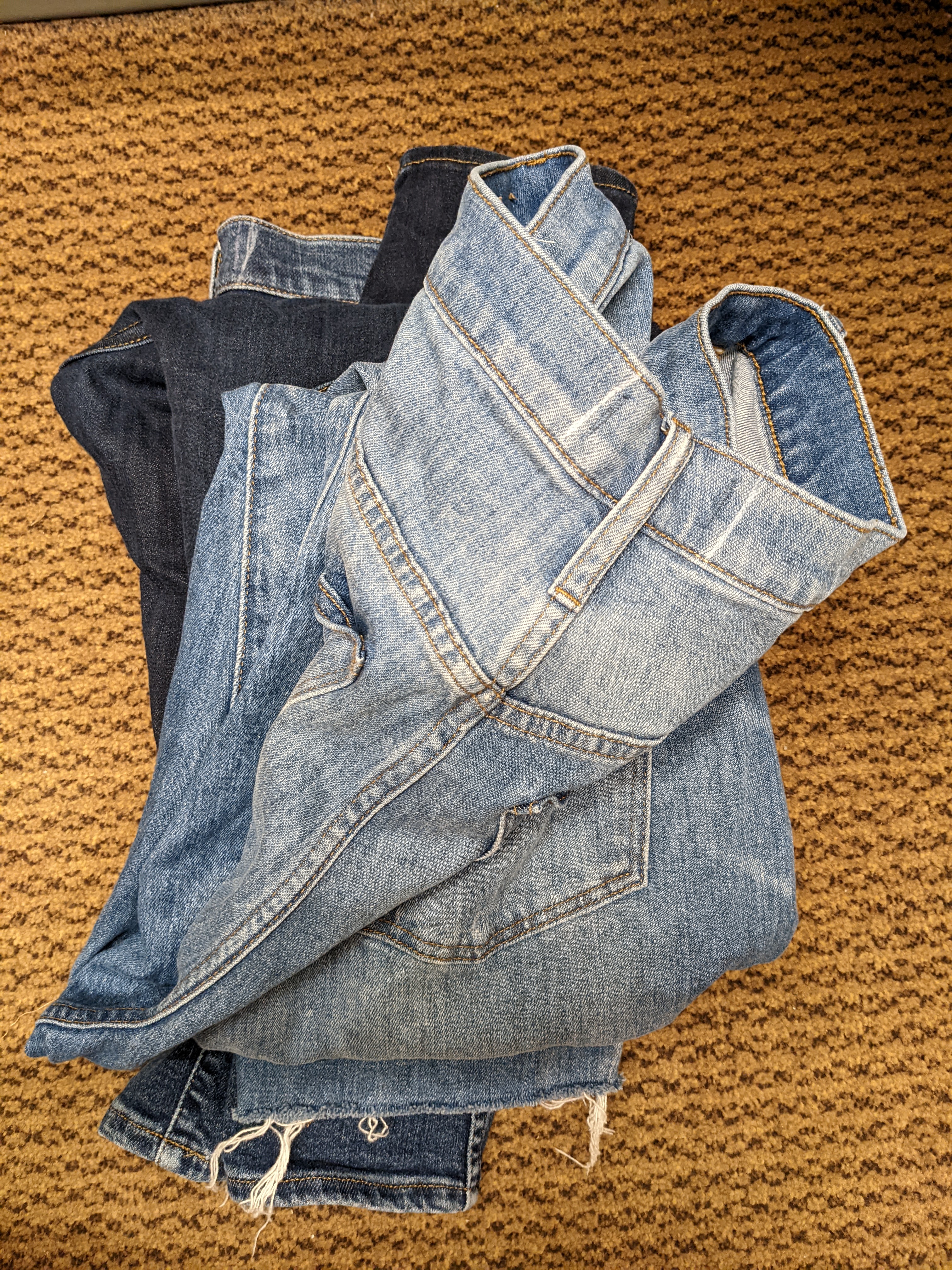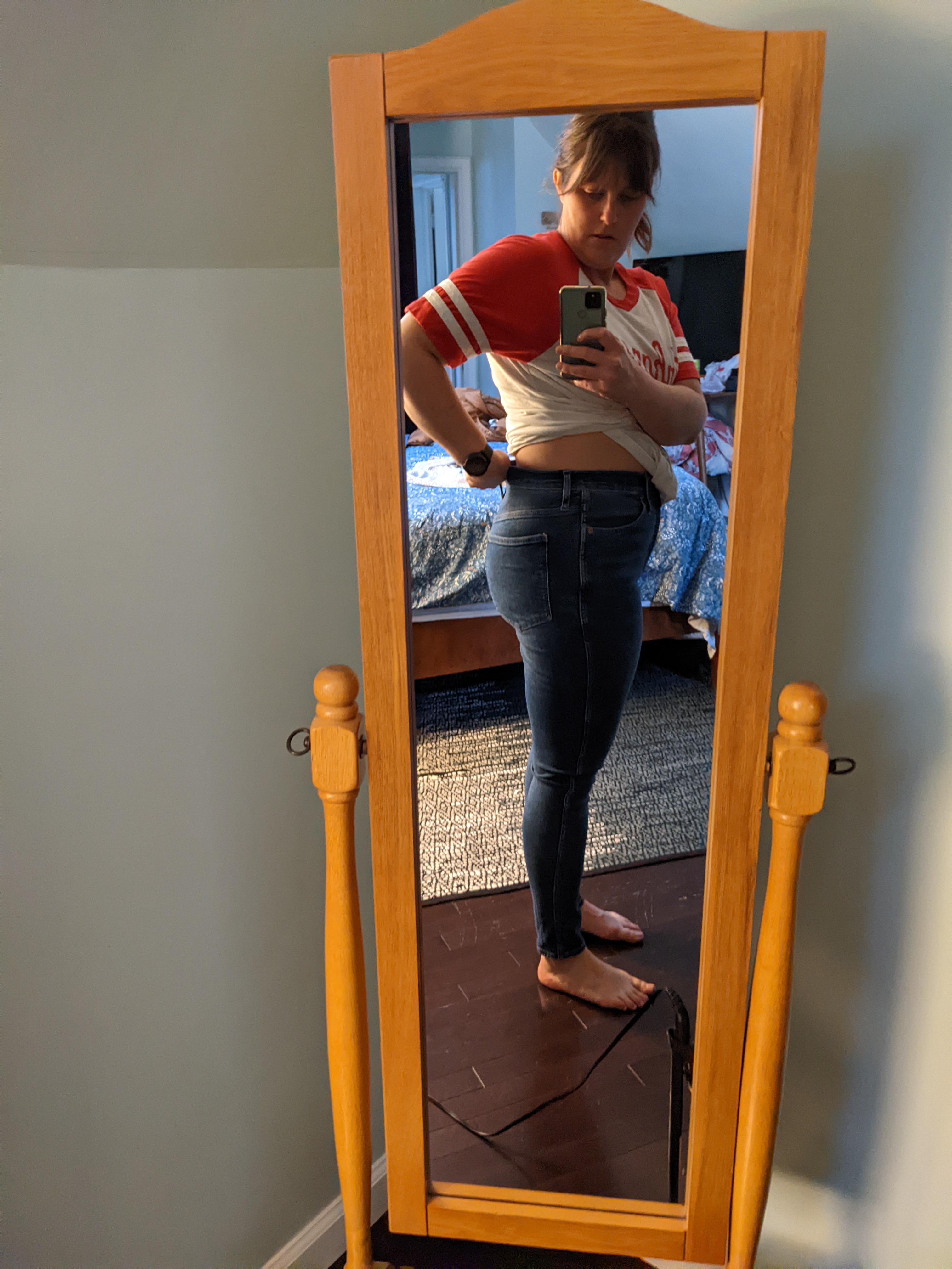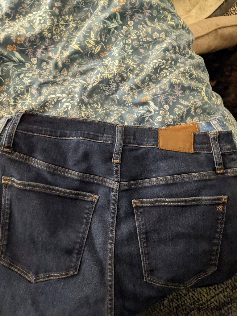 My friends recommended Madewell jeans for my wide hips and smaller waist, which I bought. My thrifty self found a few pairs secondhand on ThredUp, and then scored in the Nordstrom sale by getting 3 pairs for $150. We were getting close. My size 32s were much too large, but the size 31 was a great fit on my thighs and bootaay. And regardless, the gap persisted.